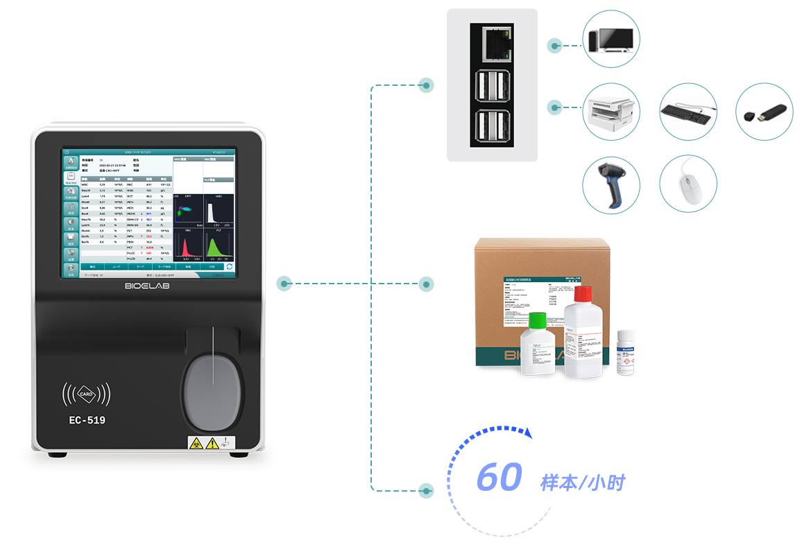 ● 基于鞘流式细胞术+三角激光散射技术,EC-519可提供完整的5分类WBC结果